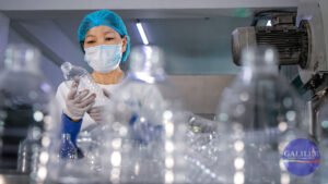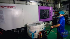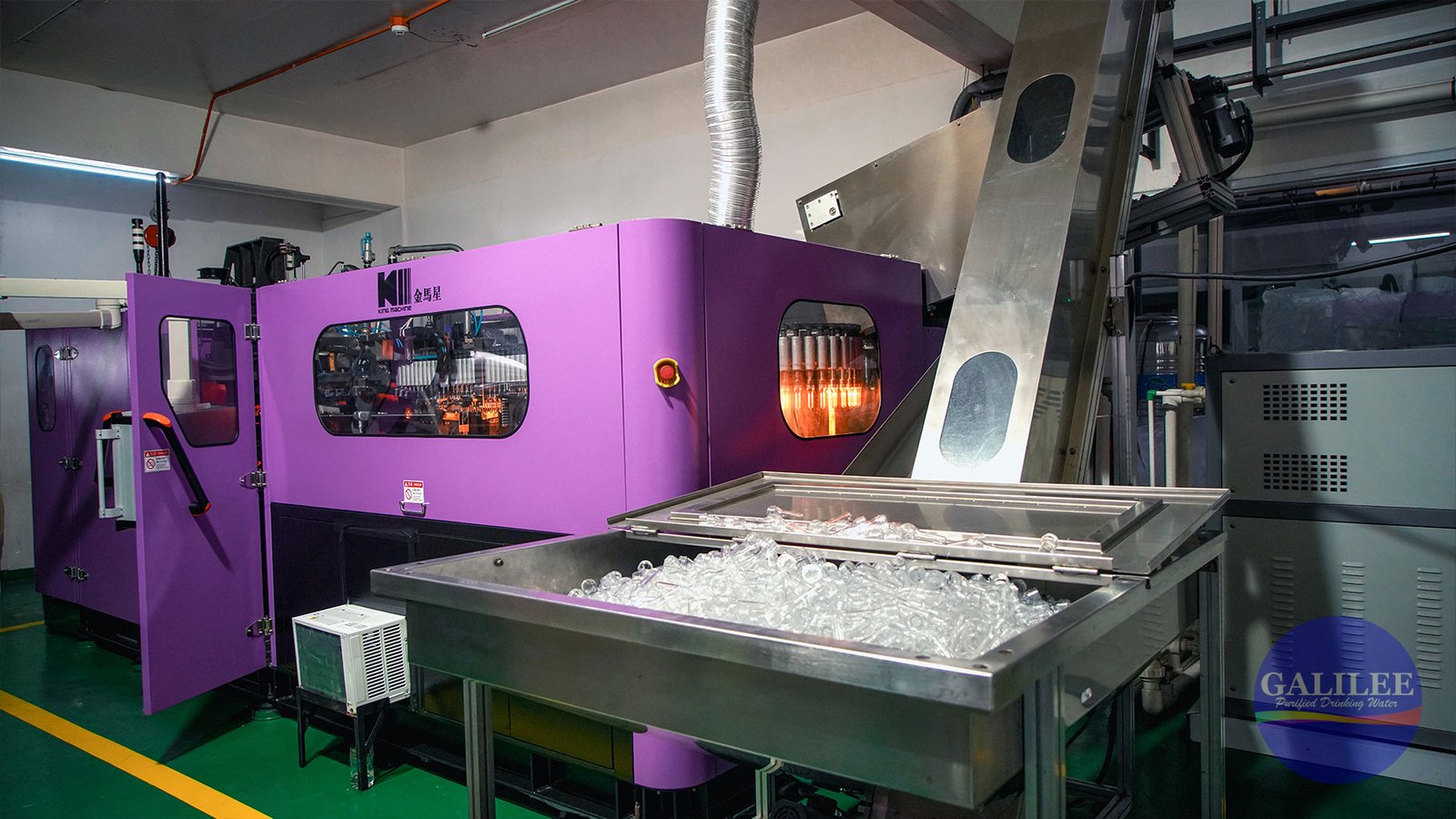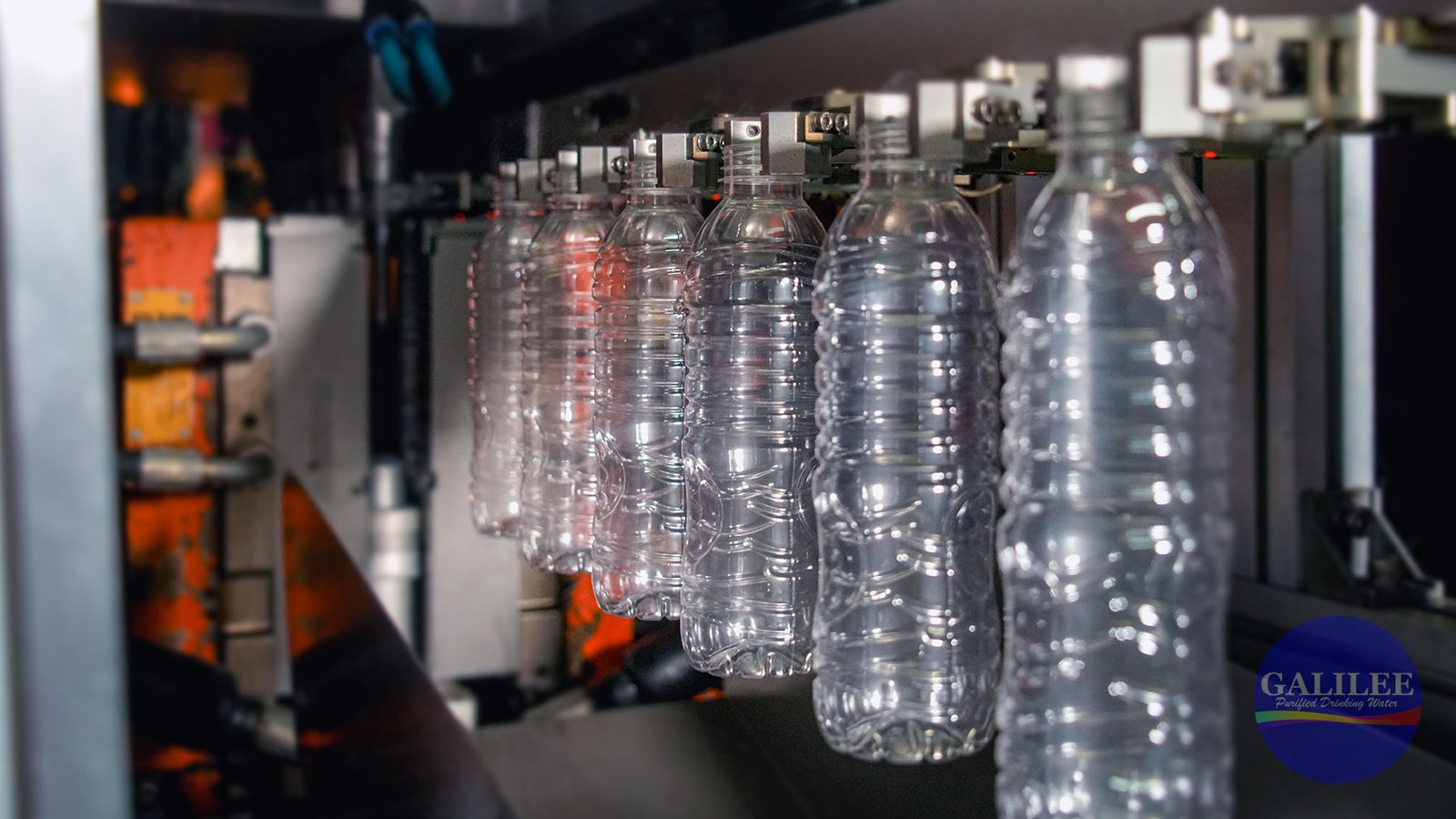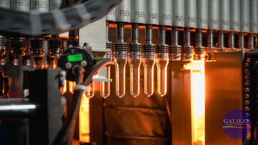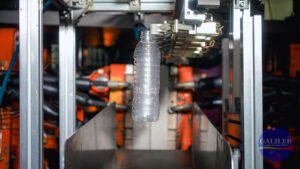 Plastic tubes called “preforms” are heated and then blown into the desired bottle shape using a blow molding machine.